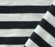 Slub streepjersey:De stof is gebreid in een slub-streepconstructie, waardoor een getextureerd patroon ontstaat met onregelmatigheden in de dikte van het garen, wat de stof een natuurlijke en licht rustieke uitstraling geeft. Het streeppatroon voegt visuele interesse en textuur toe aan de stof terwijl het glad en comfortabel blijft. Het tricot breisel biedt flexibiliteit en stretch, waardoor het ideaal is voor kledingstukken die zowel comfortabel als stijlvol moeten zijn.